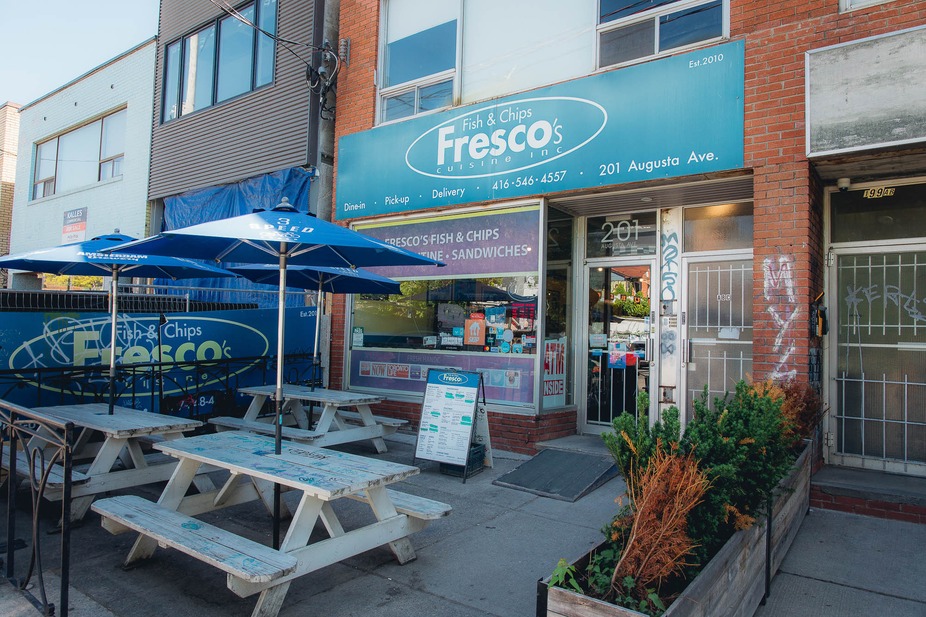using wheat flour and yellow corn flour. We love our customers, so we make our coleslaw by hand with fresh Ontario-grown veggies and a delicious creamy dressing. We love our planet, so we use all biodegradable takeout cutlery and packaging. We recycle in the restaurant and encourage the same at home. Try one of our specialties: amazing Quebec-style poutine! Alternatively, try our filling and delicious Meat Chili Poutine, loaded with Michael’s incredible home-made chili and white cheddar cheese curds. Try substituting sweet potato fries for a tasty twist on the traditional meal! For our Vegan friends and customers, we offer Daiya, a delicious dairy, lactose, casein, gluten, and soy-free alternative to traditional cheese, as well as a fresh Ontario-grown Vegan Mushroom Gravy for the best Vegan Poutine or you have ever had. Michael’s savory Vegan Chili is a great addition for a hungry herbivore. None of our carefully selected ingredients contains peanuts: we are a peanut-free zone. From our deep-fried pickles to our extra crispy Miss Vicky’s style batter, we are always adding interesting options and are always on the lookout for healthy and stimulating new flavors and ideas! Stop by and listen to the Beatles with us while you eat in the heart of Kensington Market, or take your food to go! We look forward to seeing you soon!